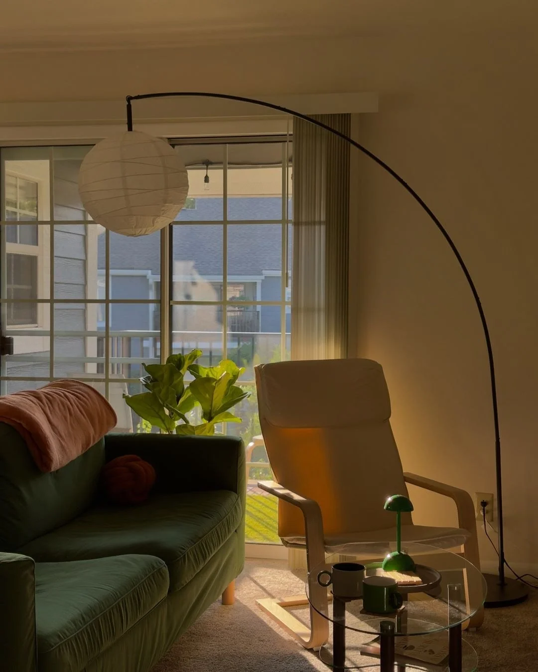 “Some of my favorite decor pieces are my IKEA donut lamp, my turntable, my coffee table, and my IKEA hanging paper lantern lamp! The element that I am most proud of in my space is how it looks in the evening and at night. Once the sun starts to fade, with an app, I can turn on my lamps and create an elegant ambiance that makes the space feel warm and cozy.”